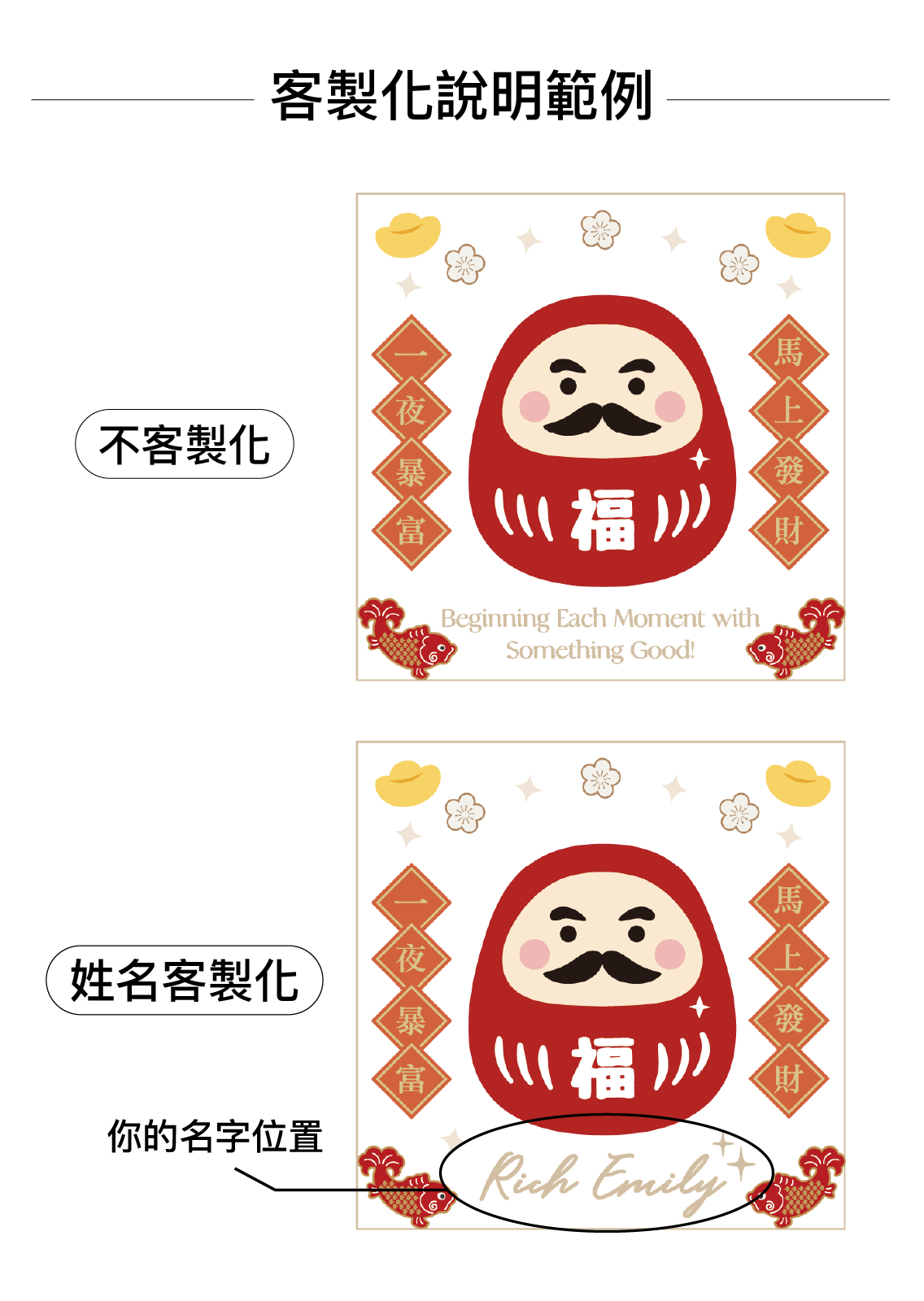 可以放自己的名字~~讓招財貓跟達摩幫妳守護財運和好運🧧
